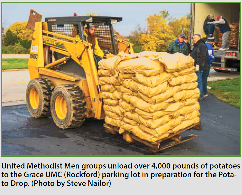 United Methodist Men from Grace United Methodist Church (Rockford), the UMC of New Lenox, and the Prairie North District partnered with Society of St. Andrew this fall to give away fresh produce and other basics to their neighbors. The give-away that took place at Grace UMC on Oct. 28 (with a satellite distribution site at Court Street UMC) distributed 42,000 pounds of potatoes (1.4 million servings of food) for people in seven counties. It caught the attention of Rockford WREX-TV’s newscast in October. Over the years, the Prairie North District has provided over 294,000 pounds of food to area residents through local community food pantries. The New Lenox UMM hosted a drive-through event on Oct. 14 and distributed 45,000 pounds of potatoes, many crates of water, Starbucks coffee, graham crackers, and boxed cereal through the generosity of Hands of Hope of Illinois.
